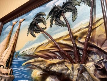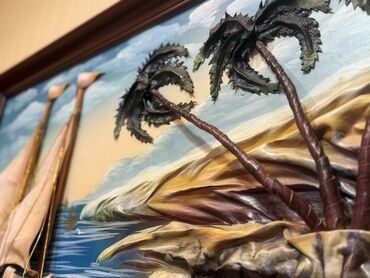 - Texnika: yüksək relyefli 3D kompozisiya. Palma gövdələri, yarpaqları və yelkənlər həqiqi dəri parçalarından formalaşdırılıb; fon rəsm texnikası ilə işlənib.