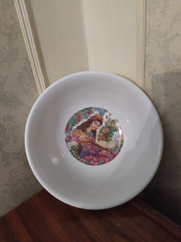 Pulsuz çatdırılmaSOVET dövründə istehsal olunmuş ağ rəngli dərin plastik qab (cam/plastik tipli servis boşqabı). İç hissənin dibində rəngarəng dekor var: çiçəklər fonunda ud/saz çalan qadın təsviri. Kənarlar yumru və hamar, divarları qalın, gündəlik istifadə və ya dekor üçün uyğundur.