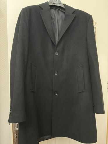 Kişi palto – FORMAT Mens Wear - Model: M.K Palto - Parça: Kashmir (kaşmir tərkibli) – etiketdə 70% viskon, 20% polyester, 2% likra qeyd olunub - Rəng: tünd (qara/tünd göy tonlu) - Ölçü: 50 (etiket...