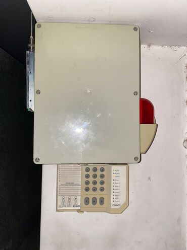 - DSC idarəetmə paneli və zəngli sirena bloku (divara quraşdırılan, yan tərəfində LED göstəricilər və rəqəmli klaviatura: 0–9, *, #, F, A, P düymələri; “Ready/Armed/System” indikatorları; “Zone 1–8” zonalarının işıq göstəriciləri).