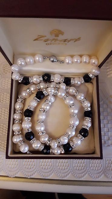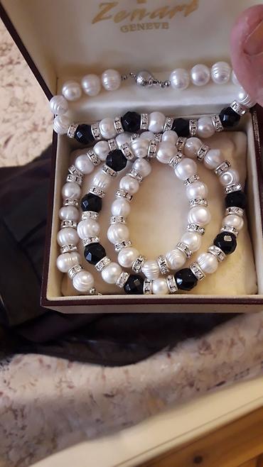 - Bilərziklər: elastik əsas üzərində ağ inci formalı muncuqlar, aralara qara fasetli muncuqlar və kristal bəzəkli halqalar yerləşdirilib