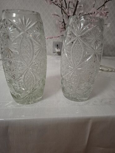 - 2 ədəd iri kəsimli şüşə vaza – silindrik/oval forma, dərin relyef naxışlı (ulduz və romb motivləri), qalın şüşə divarlar. Gül üçün və ya dekorativ istifadə üçün uyğundur.