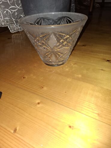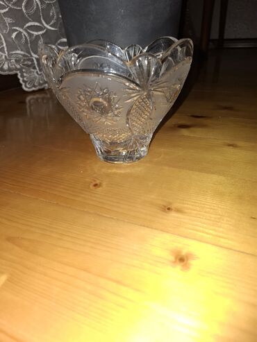 - 1 ədəd kəsimli şüşə kiçik qab – dairəvi, yuxarı hissəsi lalə ləçəyi formalı kənarlı, güclü işıq qırılması effekti verən naxışlarla.