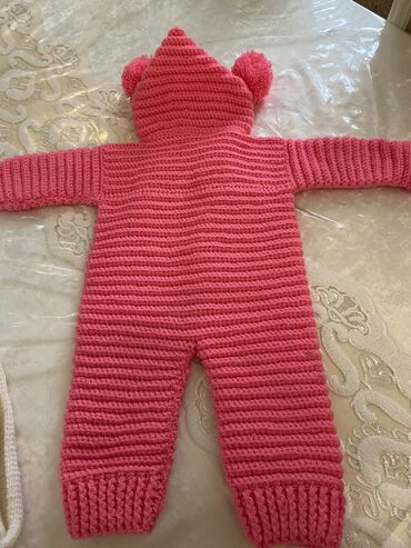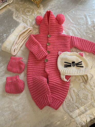 Uşaq geyim dəsti – bir neçə parçadan ibarət komplekt 1) Toxunma don və kofta - Rəng: açıq çəhrayı - Material: yumşaq ip, naxışlı hörmə - Don: qolsuz, ətək hissəsində ziqzaq naxışlar - Kofta: uzunq...