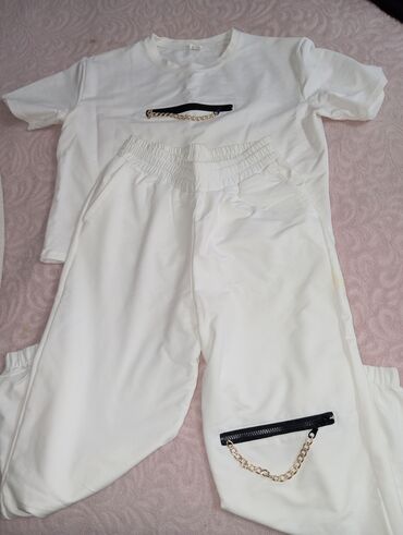 Zərif iki hissəli qadın dəsti - Üst geyim: Açıq krem rəngli, şifon tipli parça. Boyun hissəsi pudra-çəhrayı detallı və mirvari/daş aplikasiyalı. Qol kəsimləri dekorativ açıq dizaynla, kənarlarınd...