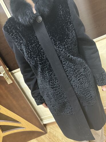 Qadın uzun palto – qara rəng Boynu temiz mex Ustu ise karakul 190 manat 38 razmer Ici astarsizdir - Dizayn: Asimmetrik ön hissə; bir tərəf hamar parça, digər tərəf isə teksturalı, parıltılı mater...