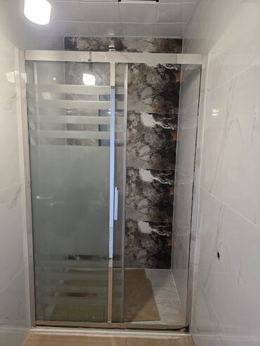 Sürüşən şüşə qapıları olan duş kabinəsi. Buzlu şüşə dizaynı vanna otağına müasir və zərif bir görünüş verir. Sürüşən mexanizm qapıların asan açılıb bağlanmasını təmin edir, bu da məkanı optimallaşdırmağa kömək edir. Vanna otağı üçün praktik və funksional seçimdir.