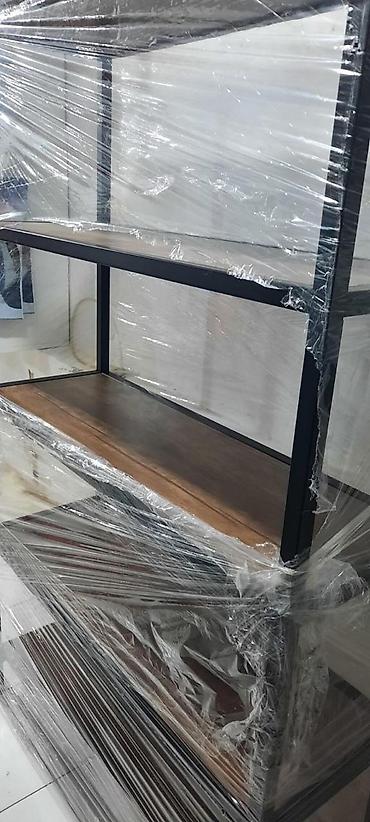 Metal karkaslı loft üslubunda kitab rəfi/stend - Dizayn: asimmetrik və modul rəflər, loft-industriyal üslub. Həm divara bərkidilən üst bölmə, həm də döşəmədə dayanan çoxsəviyyəli hissələr mövcuddu...
