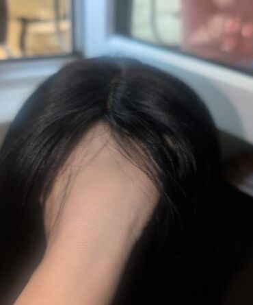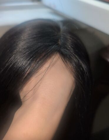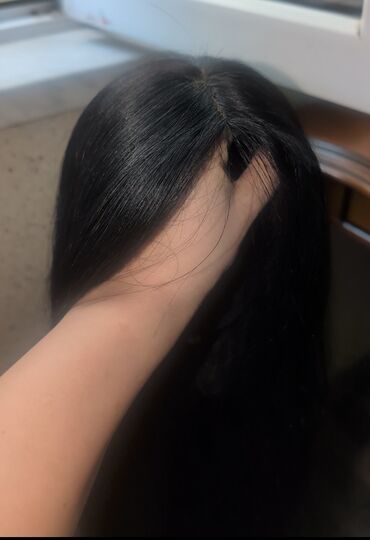 Təmiz qara rəngdə, düz və parlaq saç parçası/parik.