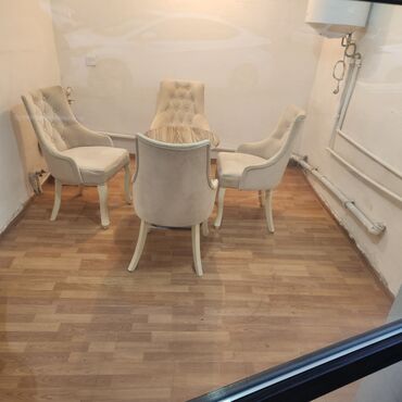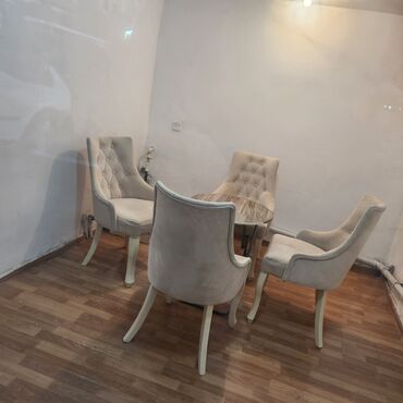 - Kreslolar: yumşaq oturacaq və bel hissəsi, kapitone düyməli arxa, qolu olan rahat forma; ağ/bej rəngli taxta ayaqlar