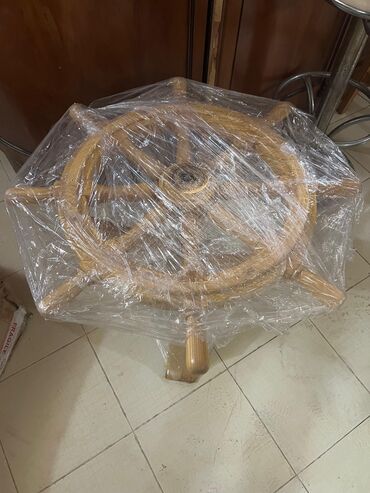 Qeyd: Ölçülər təxmini göstərilib; vizual olaraq orta ölçülü kofe/mərkəz masasıdır. Dizaynın əsas vurğusu – ağacdan “gəmi sükanı” motivli baza və dairəvi şüşə üstlük.