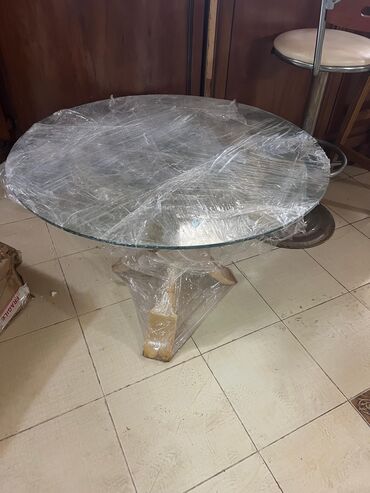 - Üst hissə: qalın dairəvi şəffaf şüşə (təxminən 90–100 sm diametr; fotoya əsasən). Kənarları cilalanmış, səth hamar.