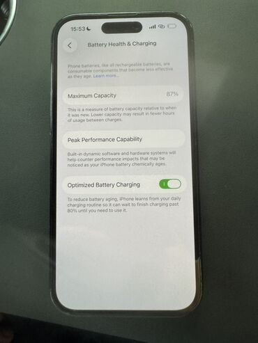 - Batareya: Ayarlar > Battery Health & Charging bölməsində “Maximum Capacity: 87%” göstərilir. “Optimized Battery Charging” aktivdir.