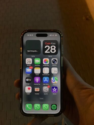 Apple iPhone (Pro seriyası) Xüsusiyyətlər: - Korpus: fırçalanmış titan çərçivə, mat arxa səth, kvadrat kənarlar - Rəng: boz/titan tonu - Ekran: tam ekran panel, ön hissədə Face ID üçün Dynamic Isl...
