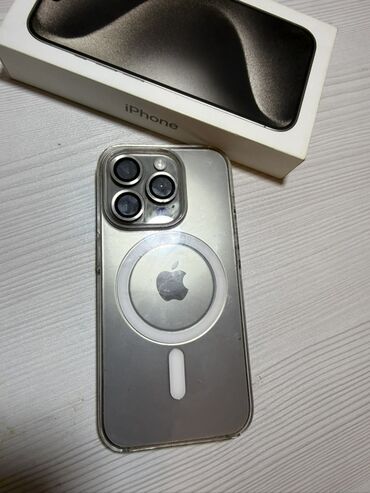 Apple iPhone (Pro seriyası) Xüsusiyyətlər: - Korpus: fırçalanmış titan çərçivə, mat arxa səth, kvadrat kənarlar - Rəng: boz/titan tonu - Ekran: tam ekran panel, ön hissədə Face ID üçün Dynamic Isl...