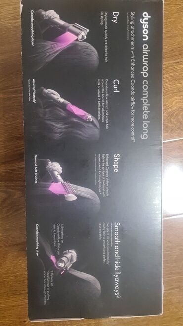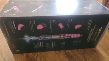 Qutunun üzərindəki məlumat: “Curl. Shape. Smooth and hide flyaways. With no extreme heat.”, “Styling attachments designed for chest-length hair or longer.”