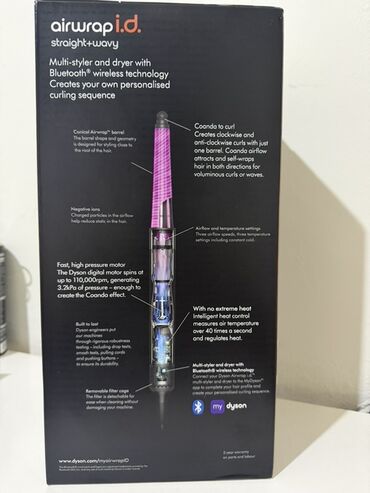 - Bluetooth simsiz texnologiyası və MyDyson tətbiqi ilə fərdiləşdirilmiş burma ardıcıllığı: Wrap, Style, Set – bir düymə ilə.
