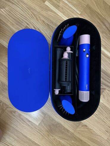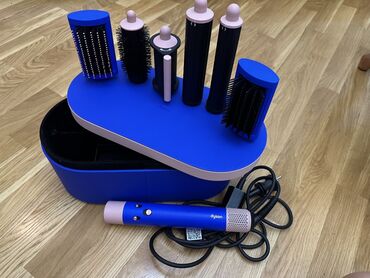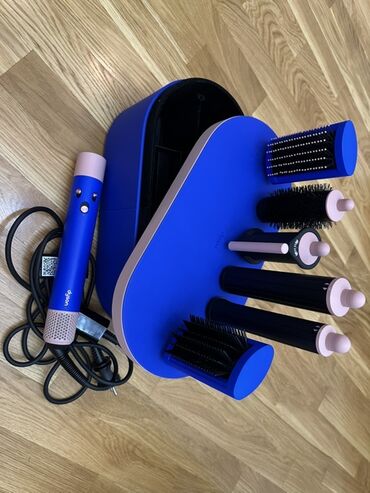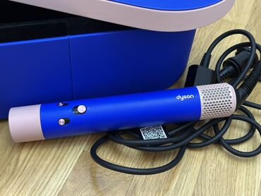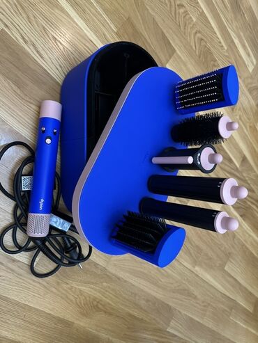 Saçın müxtəlif tiplərinə uyğun çoxfunksiyalı stilinq aləti. Rəng: kobalt mavi/çəhrayı. Markalanma: Dyson. QR kod etiketli kabel blokunda görünür.