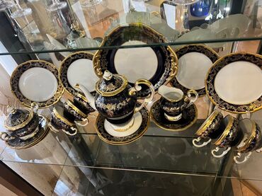 Porselen çay dəsti – klassik dizayn Rəng: tünd göy və ağ, qızılı haşiyə və naxışlarla Material: yüksək keyfiyyətli porselen Dəst tərkibi (şəkillərdə gördüyünüz): - 1 ədəd hündür çaynik (qapaqlı) ...
