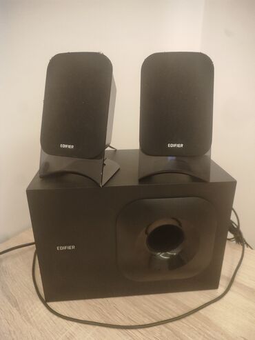 Qutuda görünənlər: subvufer, iki peyk dinamik, qoşulma kabelləri (RCA). Model: Edifier M1370BT Multimedia Speaker.