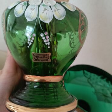 Şüşə qablar dəsti – vitrinlik kolleksiya - Yaşıl şüşədən dekorativ karaf və 6 ədəd qədəh dəsti: əllə çəkilmiş ağ-sarı çiçək işləmələri, qızılı haşiyələr. Karaf qapaqlıdır. - Qara-qızılı rəng palit...