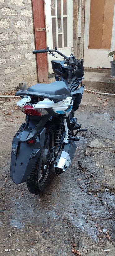 Moped/motosiklet – sport üslubunda şəhər üçün ideal model - Rəng: göy-qara-ağ, sport zolaqlı dizayn - Kuzov tipi: underbone/scooter hibrid (ayaqüstü tunellə) - Mühərrik: tək silindrli benzinli (ha...