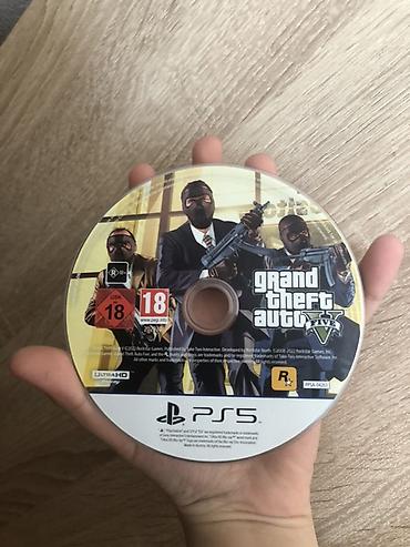 Vizual məlumat: Şəkillərdə oyun diskinin ön və arxa səthləri göstərilir. Etiketdə “Grand Theft Auto V” loqosu, reytinq nişanları və PS5 markalanması mövcuddur. Disk təkdir, qablaşdırma şəkillərdə görünmür.