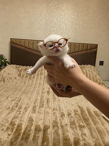 Ağ rəngli Scottish Fold balası - Cins: Scottish Fold (qatlanmış qulaqlar) - Rəng: tam ağ, yumşaq və sıx yun - Gözlər: böyük və ifadəli tünd-boz - Burun: açıq çəhrayı - Xasiyyət: mehriban, sakit və...