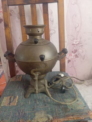 Elektrik samovar - Material: cilalanmış metal korpus, dekorativ naxışlı yan qulplar və ayaqlar - Güc mənbəyi: şəbəkəyə qoşulan elektrik naqili (toxunma izolyasiyalı, fişlə) - Üst hissə: çıxarıla b...