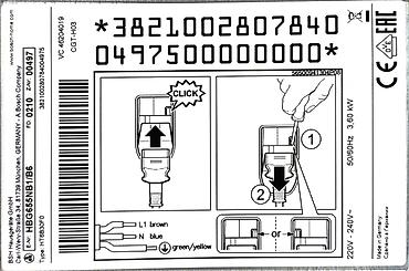 - Bağlantı: L1 brown, N blue, PE green/yellow (etiket üzərində sxem var)