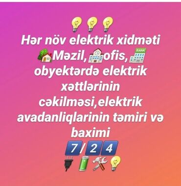 Salam Mənzillərə obyektlərə və sair mükəmməl elektirik işi görmək lazım olsa müraciət edə bilərsiz usta İmran hər zaman sizinlədir