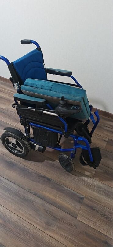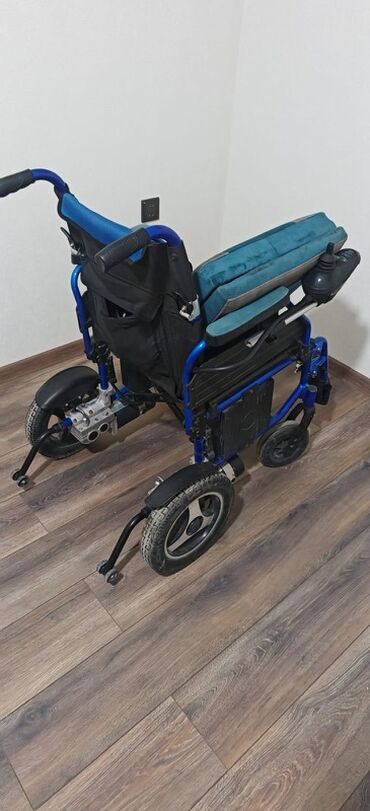 Elektrik təkərli kreslo - İdarəetmə: Sağ tərəfdə joystick paneli (güc düyməsi, sürət tənzimləmə və istiqamət nəzarəti). - Konstruksiya: Möhkəm mavi alüminium/metal çərçivə, qatlanabilən arxa dayaq...