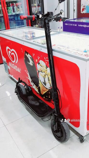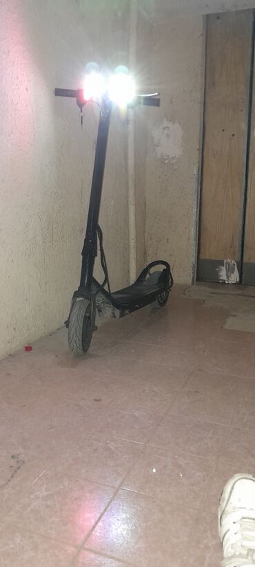 Fırlanan qatlanan mexanizmə malik qara rəngli elektrik skuter. Sağ qolu aşağıya əyilmiş vəziyyətdə dayaq var. Skuterin ön hissəsində işıqlandırma üçün parlaq lampalar var. Səyahət və gəzinti üçün uyğundur.Hecbir problemi yoxdur ideal veziyyetdedir sureti 35 acarla işe düşür vhatsapa yazn