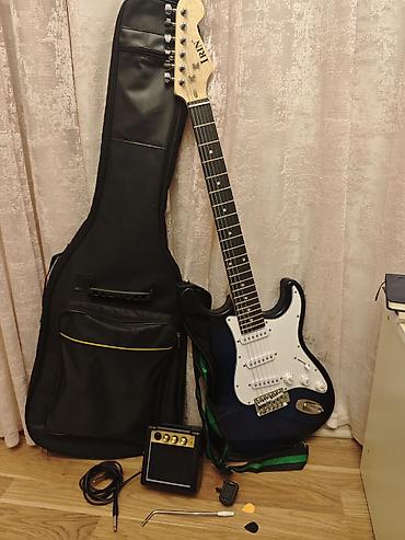 Elektrik gitar dəsti – Strat tipli gövdə, mavi-qara (sunburst) rəng keçidi, ağ pickguard. 3 single-coil pikap, 5‑yollu selektor, Volume və 2 Tone nəzarətləri, tremolo körpüsü (whammy bar komplektdə). Klavitura 21 ladlı, bolt-on sap, xrom mexaniki qulplar. Genişliyi tənzimlənən yaşıl çiyin kəməri ilə.
