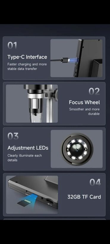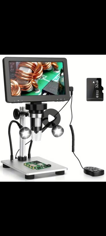 Pulsuz çatdırılmaElektron mikroskop. Təzədir işlənməyib qutudadır. 1200x böyütmə gücünə malikdir. alüminium kiçik platforması və mikroskopun öz led işığından əlavə 2 ədəd led işığı var. Şəkil və video çəkilişləri üçün 32GB yaddaş kartı və orijinal pultu var. Bakı şəhəri üzrə çatdırılma pulsuzdur.