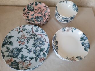 6 ədəd orta ölçü və bir ədəd böyük ölçü boşqab Gündəlik və tort qabları kimi istifadə olunmaq üçün uyğundur. Yenidir. İstifadə olunmayıb. Süfrədə zərif və fərqli görüntü yaradacaq