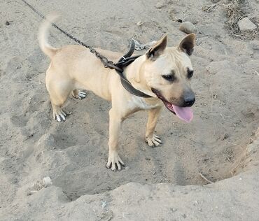 Amerikan Pit Bull tipli gənc it - Rəng: qum rəngi/tan, sinə və pəncələrdə ağ ləkələr - Quşqun qulaqlar, qısa tüklü, idman quruluşlu bədən - Boyunluqda tənzimlənən yaxalıq və kəndirlə gəzdirməyə ha...
