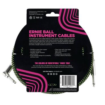 Ernie Ball alət kabelləri davamlı olaraq üstün komponentlərlə hazırlanmış yüksək keyfiyyətli dizayna malikdir. Çoxsaylı qoruyucu materiallar siqnalı aşağı idarəetmə səsi ilə qoruyur. Kabel uzunluğu 10ft (3.05m).