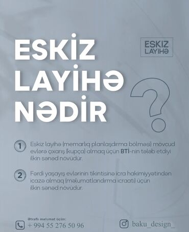 **Əmlakda güvən keyfiyyətdə fərq yaradan ünvan** Evinizə qeyri-yaşayış sahənizə (obyekt) ÇIXARIŞı almaq daha rahatıdr. 1kvm 1 manatdan eskiz layihənizi hazırlayıb sizə təhvil veririk. Eskiz layihə...