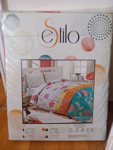 İki ədəd yorğan/örtük dəsti - Model 1: Mavi əsaslı, qırmızı, bənövşəyi və ağ zolaqlı naxış, aralarda dairə motivləri. Rənglər parlaqdır, yataq otağına enerjili görüntü verir. - Model 2: Bənövşəyi ...