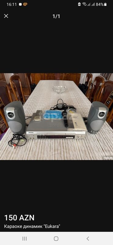 Əla ev karaoke həlli: səsucaldanları qoşun, mikrofonları taxın və mahnılarınızı diskdən oxudun. Ekrandakı məlumatda göstərilib: 100 AZN, “Karaoke dinamık ‘Eukara’”.