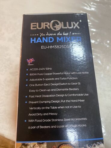 Mikser “Eurolux EU-SM3981SBB” ✅İstehlak gücü 1600 vt ✅möhkəm dəmirdən başlıqlar ✅sürət tənzimləməsi var ✅8 litrlik qulplu paslanmayan polad qab ✅Xəmir hazırlayan qarmaq, yumurta çalan və qarışd...
