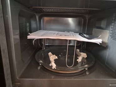 Qutudakı aksesuarlar: şüşə boşqab, dönəvər halqa və dayaq elementləri, metal rəf, təlimat kitabçası.