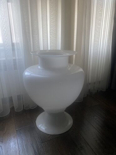 - Böyük dekorativ vaza: ağ, parlaq səth, geniş boğazlı və pedestallı forma. Tək və ya quru/gövdəli güllərlə istifadə üçün uyğundur.