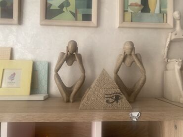 - Müasir skulptur: açıq rəngli tekstural materialdan abstrakt oturan fiqur, qara bazada. Minimalist/interyer aktsenti kimi vitrində, rəfdə və ya iş masasının üzərində nümayiş üçün ideal.