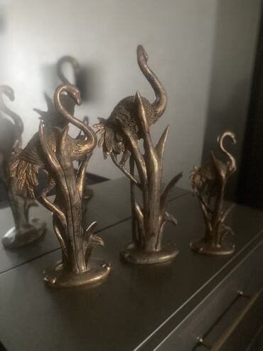 - Dekorativ heykəlciklər (3 ədəd): bronz tonlu qu quşu kompozisiyaları, bitki formalı dayaqlar üzərində. Konsol, kamod və ya şkaf üstü üçün aktsent dekor.