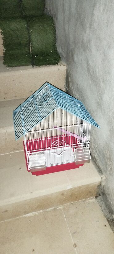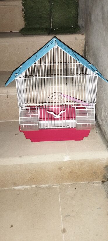 Quş qəfəsi – ev şəklində damlı model - Material: metaldan möhkəm barmaqlıqlar, plastik altlıq - Rəng: açıq bənövşəyi metal karkas, ağ altlıq - Üst hissə: geniş, üçbucaq formalı dam quruluşu – əlav...