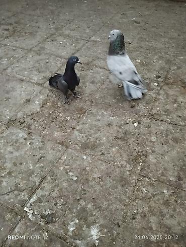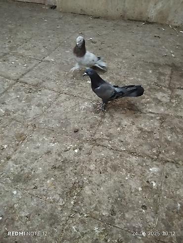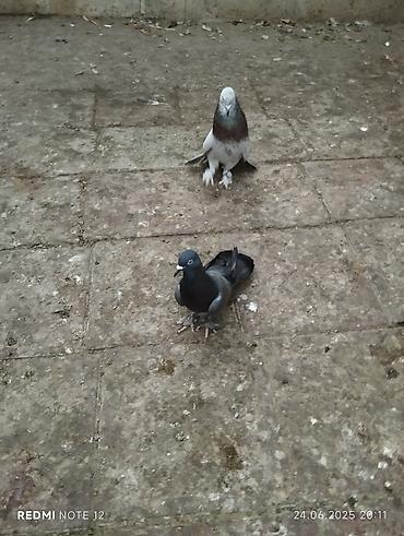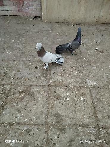 Ağ rəngli bəzəkli göyərçinlər – quyruğu yelpikvari geniş, ayaqları tüklü. Fotolarda 2 quş görünür, birinin quyruq uclarında qara naxışlar var. Uçuşu güclü, havada sabitdir (şəkillərdə uçuş kadrı va...