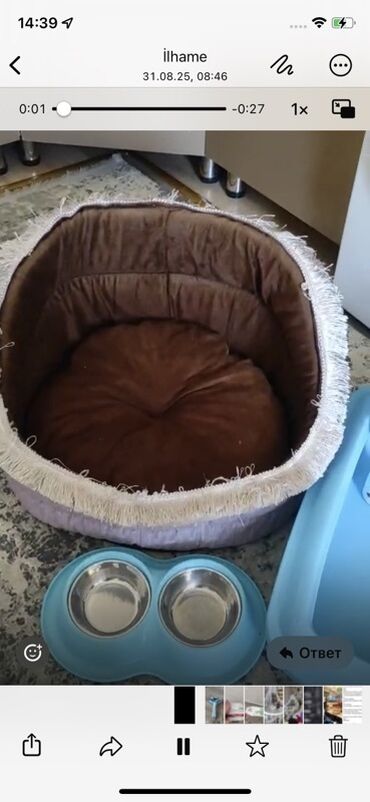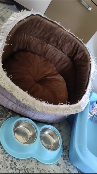 - Yumşaq rahat yataq: dairəvi formalı, qalın kənarlı, içi yastıqlı. Kənarında püsküllü bəzək, iç hissə qəhvəyi, kənarları açıq rənglidir. Kiçik və orta ölçülü pişik/itin istirahəti üçün uyğundur.