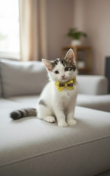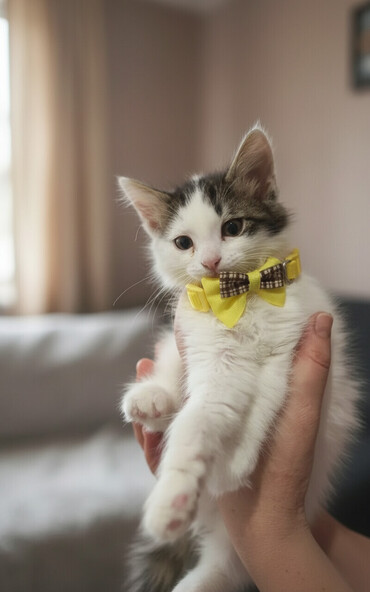 Ev pişiyi – üçrəng (ağ, boz və qəhvəyi ləkəli) kürklü, qısa tüklü, orta ölçülü. - Yumşaq və zərif görünüşlü, ev şəraitinə uyğun. - Şirin mimikalar, iri qulaqlar və zərif pəncələr. - Sakit, evdə sak...